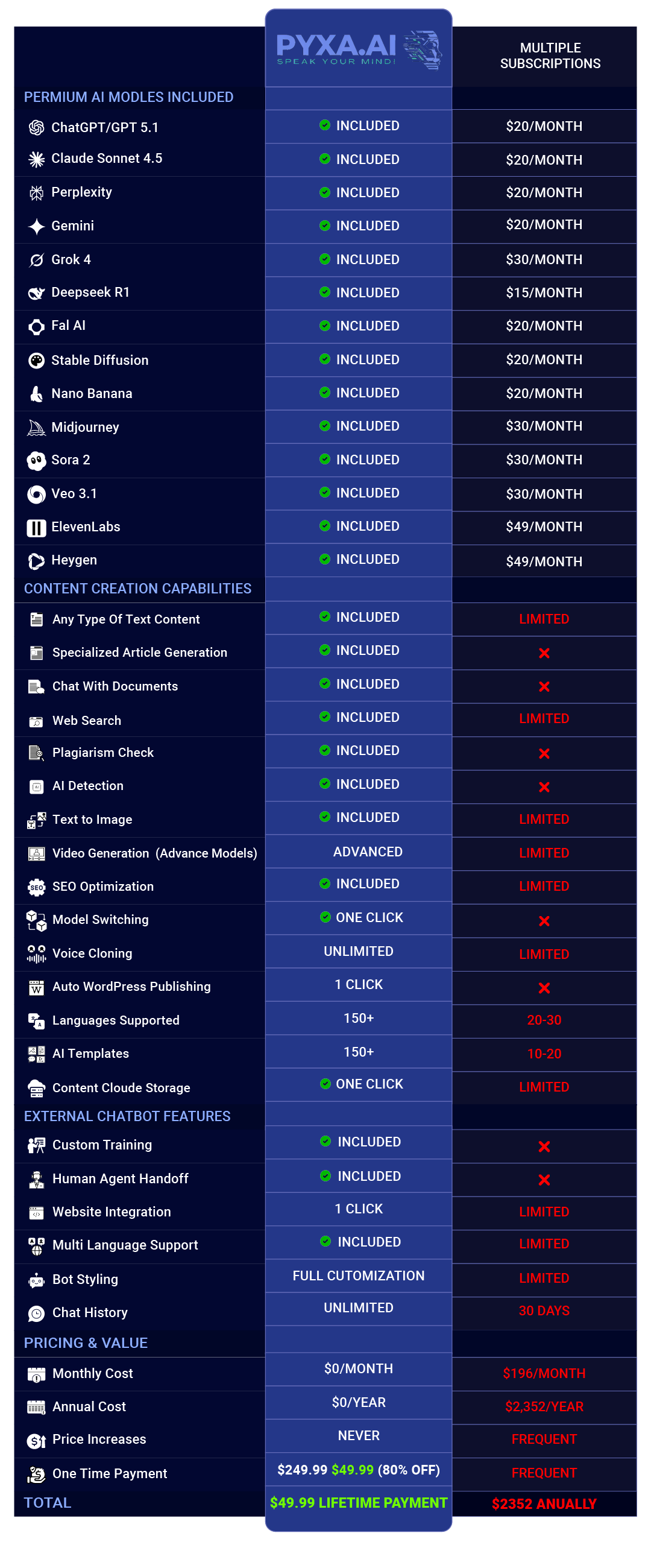 Stop juggling subscriptions and paying monthly for tools you can get with one lifetime payment. See how PYXA compares to using multiple specialized platforms.