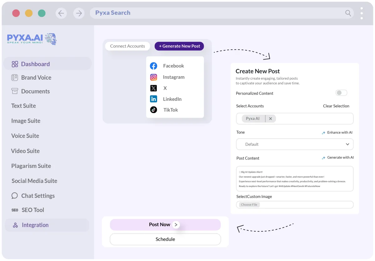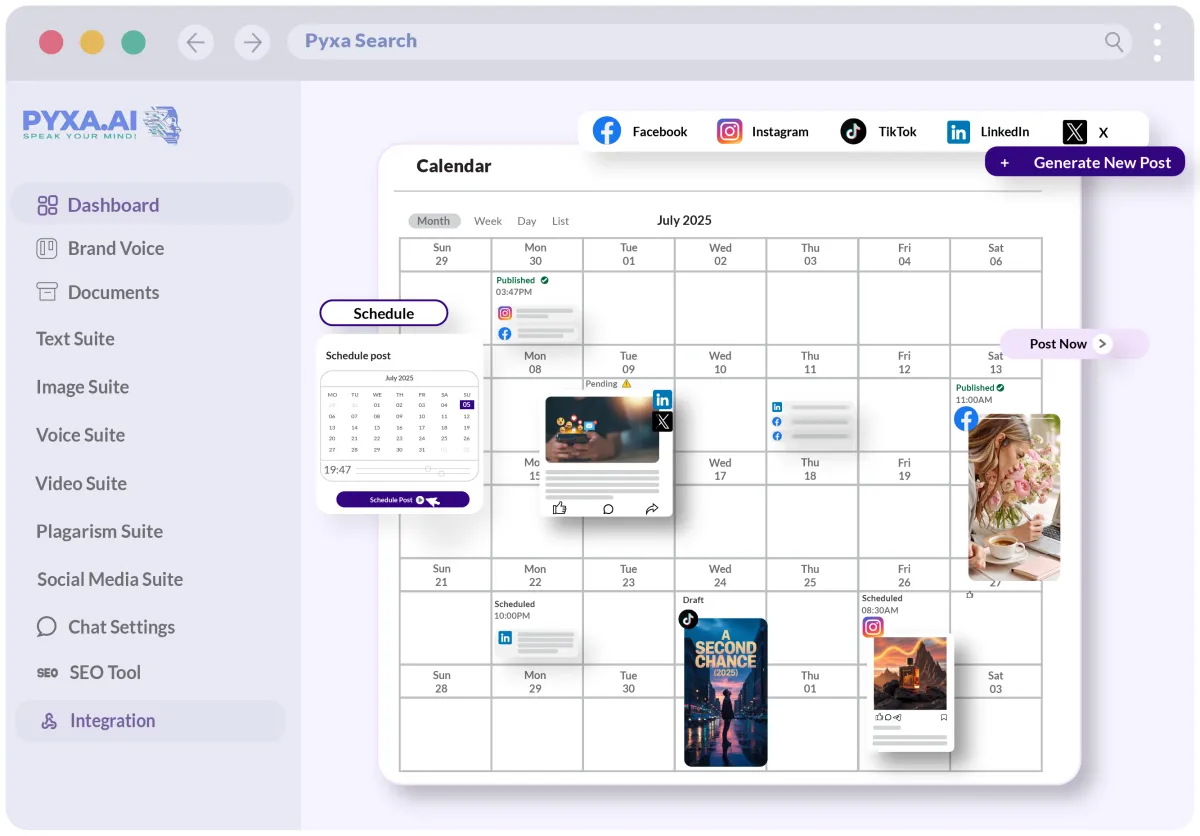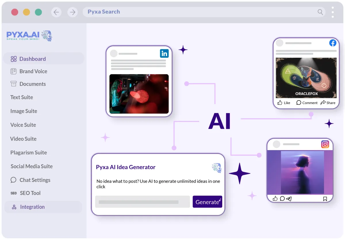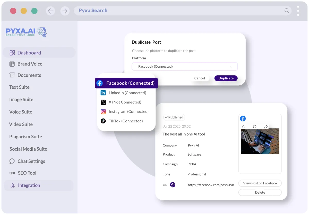 Create content that ranks and converts. Our AI automatically optimizes everything you publish across all platforms, boosting engagement and driving real growth with every post. Watch your metrics climb as you create more content using Pyxa AI Suite.
