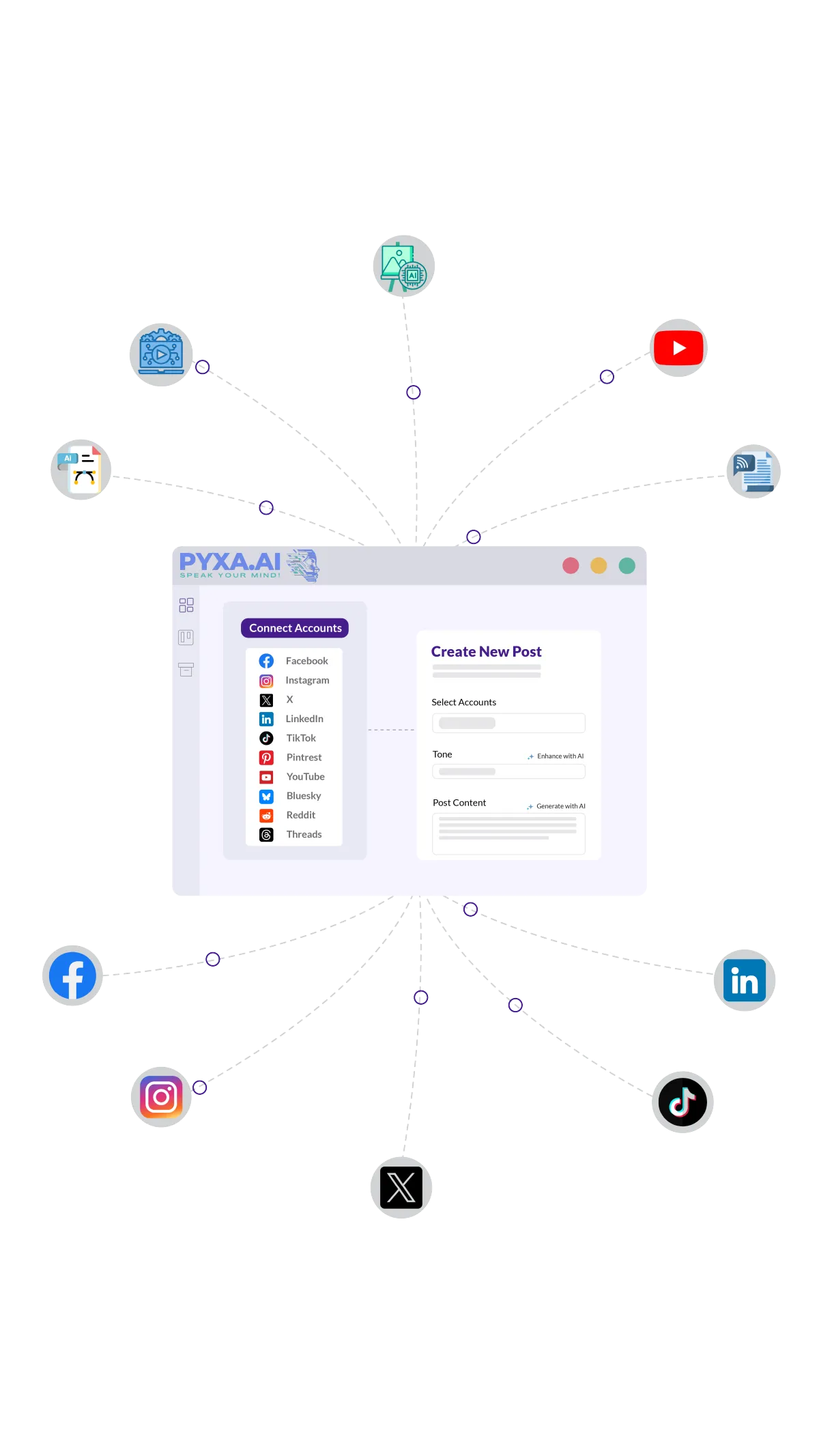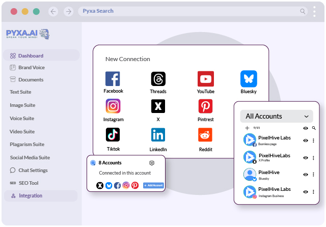 Link your Instagram Facebook, TikTok, X, LinkedIn, YouTube, Pinterest and more to Pyxa and handle all your posting from one unified space.