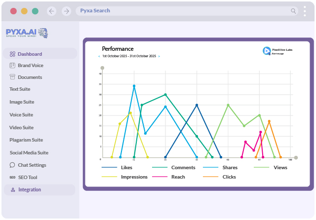 Monitor your performance across every connected platform with real-time analytics inside Pyxa.ai. View impressions, reach, engagement, clicks, and more to understand what works best and refine your social media strategy effortlessly.
