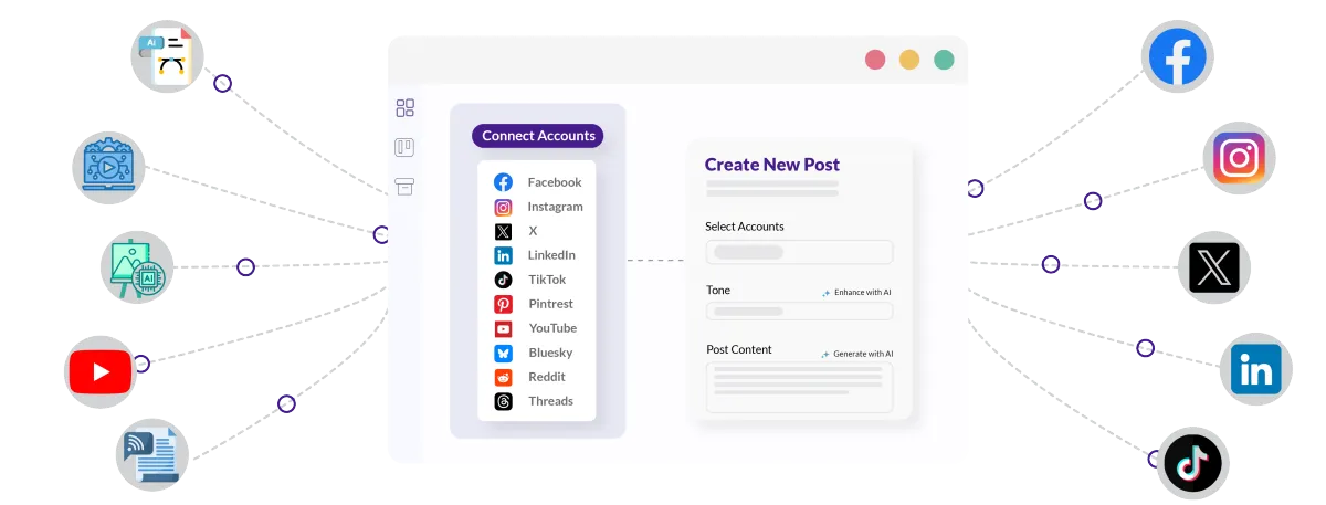 Connect all your tools instantly from social media to WordPress. Manage your digital presence in one place while staying ahead with the latest AI advancements. Streamline your workflow with seamless integrations, saving you countless hours.